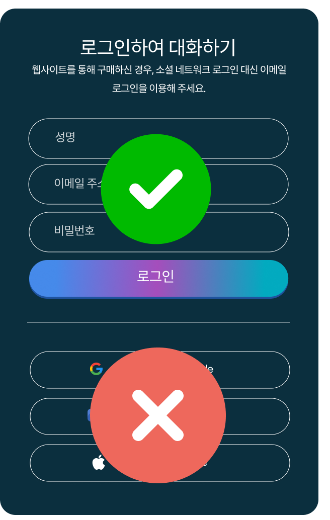 *소셜 로그인 옵션은 사용하지 마세요. 정상적으로 작동하지 않습니다.